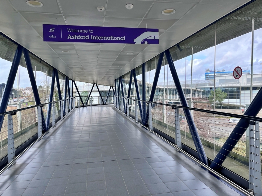 "High Speed 1" branding greets passengers as they may their way over the footbridge from the multi-storey car park. Through the glazing on the right, in the background, can be seen the top of the office block "International House". This was completed in 1974 with 86,000 square feet of floor space and was referred to in the 3rd October 1975 edition of the "Kentish Express" as Ashford's answer to London's "Centre Point", the latter on the corner of Oxford Street and Tottenham Court Road. The block has been named "International House" since it opened and thus has not later acquired the title as a result of the arrival of Eurostar in 1996. © David Glasspool