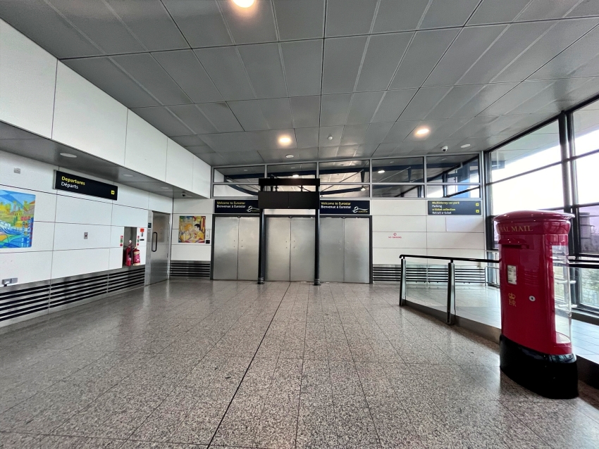 The author has ascended the staircase seen on the right of the previous photograph. At the top, the barricaded entrance to the Eurostar departure lounge is evident. © David Glasspool