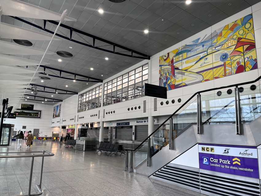 The "up" side concourse, on the south side of the station, is light and airy. Behind the glazing on the upper floor is the waiting lounge for those passengers bound for Eurostar services (naturally, at the time of this picture, the area was out of use). The colourful mural at the top right depicts a London to Paris Eurostar journey and was one of a series by artist John Lester installed at the station in about 2014. © David Glasspool
