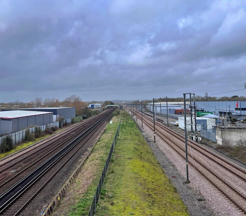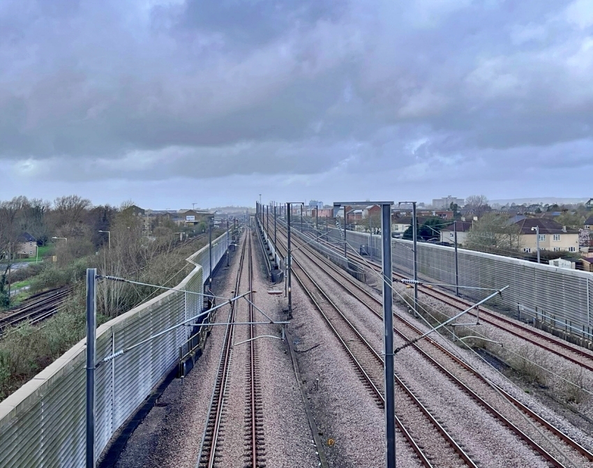 A London-bound view 1½-miles south east of Ashford, in the town's suburb of Sevington, has the Kent Coast Main Line on the left and HS1 on the right. On the latter, Ashford East Junction — where the chords to the station diverge/join — is just visible in the background. On the far left is "Sevington Loop", originally laid in 1993 in connection with the construction of the Channel Tunnel. © David Glasspool