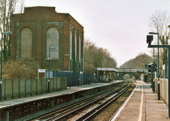 The 1954 concrete platform extensions are evident in this London-bound view, which also includes the huge substation of 1926. A section of the signal box's base was retained to form part of a wall at the rear of the "up" platform. © David Glasspool
