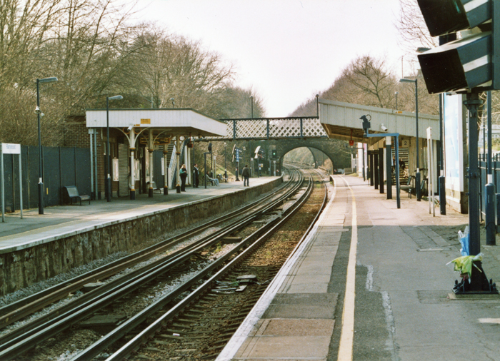 The oldest structure in this view is the lattice footbridge, which dates from the station's 1895 opening. Note that the ''up'' platform's canopy lies horizontally, but that of the ''down'' platform is angled; the valance of the latter is now formed of corrugated sheeting. This view shows the line's 1 in 75 gradient to good effect, as it ascends through the arched bridges towards London. © David Glasspool