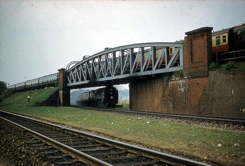 From the outset, a flat junction was provided at Worting, which saw Southampton and Salisbury routes converge on the level. Naturally, this caused conflicting movements, for trains from the alternate routes had to cross each other's paths, a situation which became more problematic as traffic increased. Nearing the end of the 19th Century, the LSWR sought to resolve this bottleneck: within an Act dated 6th July 1895, powers were obtained for widening on the north side of the route between Basingstoke and Worting Junction. This three-mile-long section was to be quadrupled to provide dedicated pairs of tracks for the two routes, and a ''flying junction'' installed to eliminate conflicting movements. Of the four lines, the central tracks were to form the approaches of the Salisbury route, whilst the outer tracks would be for Southampton traffic. The new ''up'' line from Southampton was raised upon an embankment and carried over the double-track from Salisbury upon a lattice girder bridge. The latter was of roughly semi-circular cross-section, comprising a pair of partially staggered lattice girder sides of 145-feet length. A brick-built signal-box, similar in design to that which still exists at Yeovil Junction, emerged on the ''up'' side of the junction, north of the flyover. In the earliest years, the signalman had been housed in a hut beside the line, and would step over the tracks to pull the levers to change the points. This latterly led to the recommendation of having all leavers on one side of the running lines, to save the signalman the trouble of hopping over tracks to switch the direction of travel. Battledown Flyover was brought into use for regular traffic on 30th May 1897.