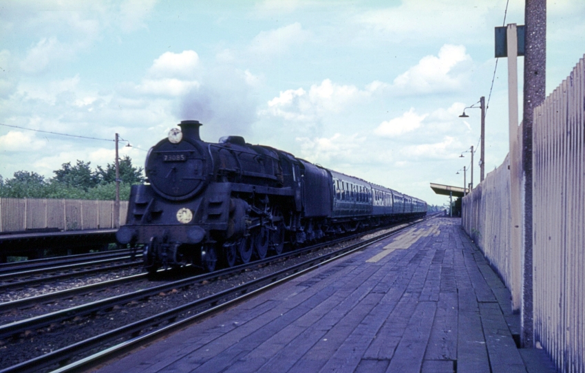 BR Standard 5MT 4-6-0 No. 73085 is seen proceeding through Berrylands on the "down" fast whilst heading the 2:54 PM Waterloo to Salisbury passenger service. The timber planking of the "down" platform here is obvious; the concrete lampposts and - in the distance - the upward-sloping canopy were original features from opening. © David Glasspool Collection