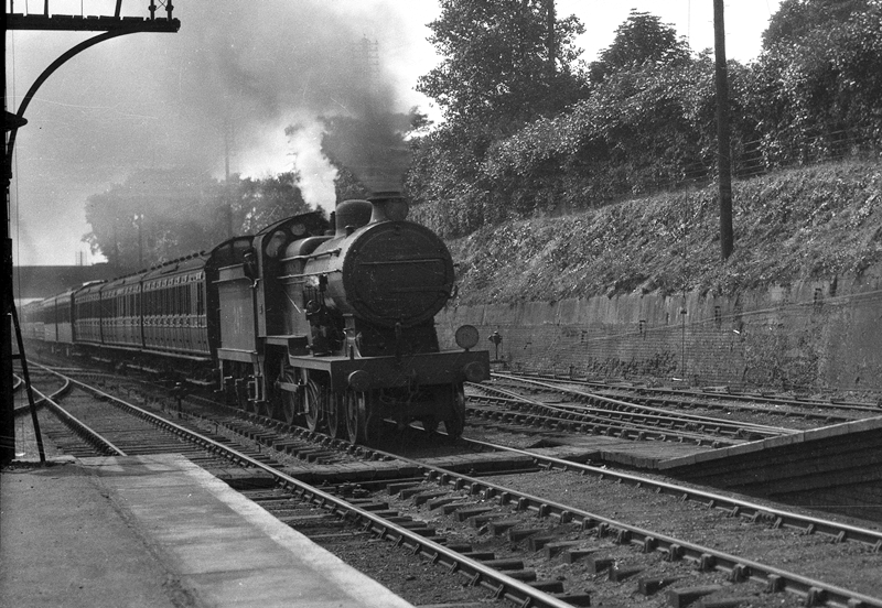 No. 247 has "Birdcage" stock and a couple of Pullman cars in tow, as it approaches the barrow crossing. This locomotive was rebuilt from a D Class in 1921 by Beyer, Peacock & Co, and remained in service until July 1961. © David Glasspool Collection