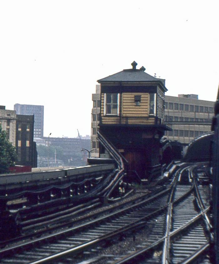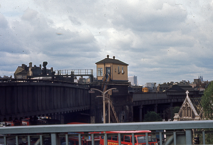 A view towards London Bridge shows Borough Market Junction signal box around the time of closure. Such was the complexity of movements through the junction and the tightness of the curves, that a 20 MPH speed limit was imposed at all times. The tracks curving to the left are those to Cannon Street. © Roger Goodrum