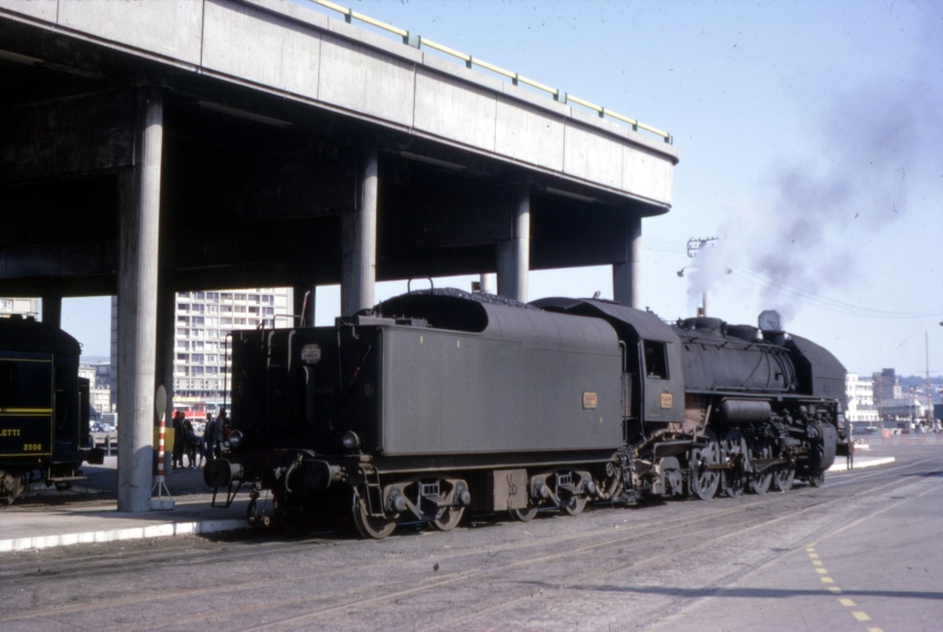 The reinforced concrete pillars supporting the car deck above the platforms of Boulogne Maritime station are evident in this south eastward view, which includes Class 141R No. 141 R 1276. This engine was one of 1,300 2-8-2 steam locomotives built in the United States and Canada for SNCF to replace those destroyed during World War II. The two tracks in the foreground and that upon which No. 141 R 1276 is situated were still in evidence in 1978, but by 1984 had been built on. © David Glasspool Collection