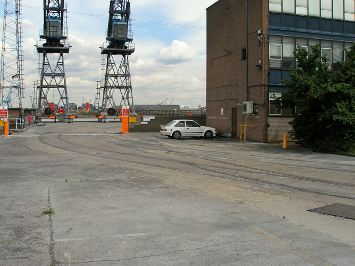 Photograph 5: The four travelling cranes - two of which are seen here - that occupied the Thames Jetty were still in evidence, as were tightly-curving standard gauge railway tracks and Thames Mills' former office block (right). The cranes went for scrap in 2013, but the office block and tracks survive..... for now. © David Glasspool