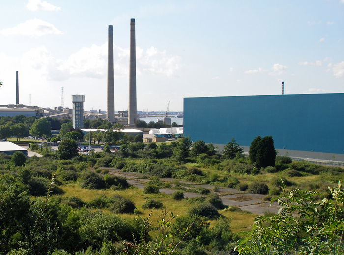 Photograph 3: This "up high" view is from London Road and shows one of the few remaining structures of Thames Mills: that of the water tower, to the left. The tower remains in use and, since 1995, has been owned by US firm "Kimberly-Clark". The large blue structure on the right is one of this company's centres for making "Andrex" toilet paper. This building replaced a warehouse of the original Thames Mills operation, which was destroyed by a huge fire on 10th July 2004. The large open area in the foreground was formerly the coal stacking area for the now long-defunct Northfleet Power Station. The site is now occupied by a large distribution warehouse for supermarket "LIDL". The tall pair of chimneys in the background belonged to Northfleet Cement Works. © David Glasspool