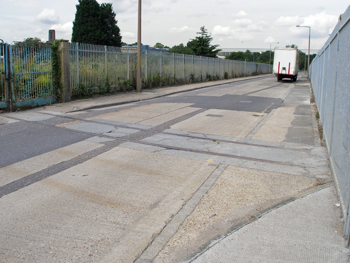 Photograph 4: Until as recently as 2017 remained the rails of the level crossing which took the mills' railway over Crete Hall Road to join, by means of a ¾-mile-long branch, the Gravesend West line at Rosherville. These rails sadly disappeared during road resurfacing. © David Glasspool