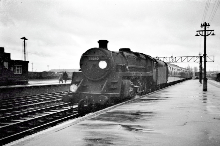 No. 73042 is seen entering Eastleigh station with an "up" service from Bournemouth West to Waterloo, Bulleid-designed carriage stock in tow. This locomotive started life on the London Midland Region and, as of 1955, was based at Chester (6A), Cheshire. By 1959, the locomotive had moved to the South Eastern Division of the Southern Region, having received Stewarts Lane allocation. After the electrification of Kent Coast lines, the engine moved to the South Western Division, being allocated to Weymouth. Withdrawal came in 1965. © David Glasspool Collection