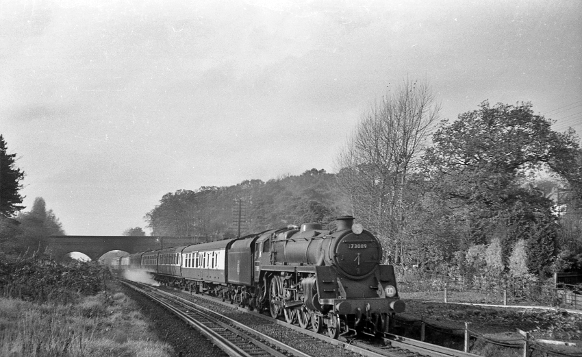 No. 73171 is seen two miles west of Brookwood, heading in the "up" direction, with a Bournemouth West to Waterloo service. On first look, the train appears freight in nature, but behind the leading vans can just be seen the profile of a passenger carriage emerging. The engine was at this time allocated to Feltham; previously, in 1959, it was based out of Leeds Holbeck (55A) on the London Midland Region. The train will shortly pass below the flyover which takes the "up" track of the branch from Alton over the main line, both merging at Pirbright Junction, the latter situated 1½-miles west of Brookwood station. © David Glasspool Collection