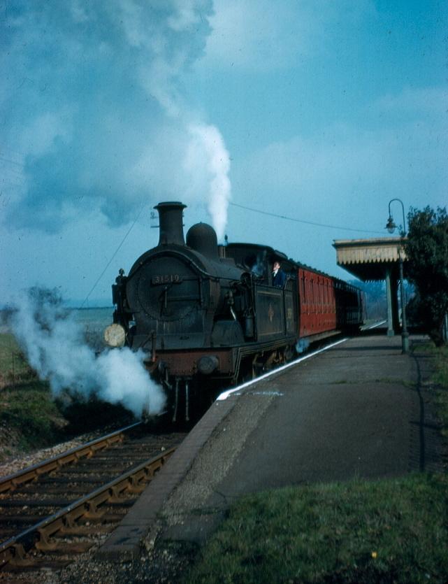 We see No. 31519 again, but this time on the return working to Dunton Green. The locomotive, which was withdrawn in February 1961, is seen propelling its stock away from Brasted. Fanning out in the foreground are the three sidings of the goods yard - of note is the white-painted manual lever, alongside the nearest set of points. © David Glasspool Collection