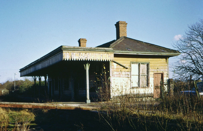 Seen eleven years after closure, the track has gone, but the main building looks remarkably complete, right down to its spiked canopy valance. Of tongue-and-groove timber construction with a hipped slated roof, the structure finally succumbed in 1978. © Tom Burnham