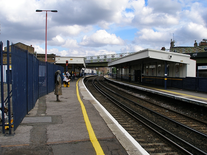 An eastward view of the Herne Hill platforms shows the remaining section of the LC&DR platform canopy on the left. This formerly extended over the area now ringed by palisade fencing. On the right is the SR canopy erected at the time of the 1925 electrification. In the background is the 1989 steel bridge carrying the South London Line over the Herne Hill route, whilst in the foreground is one of three bronze sculptures. © David Glasspool