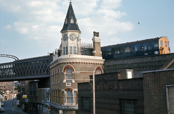 A Victoria to Sevenoaks via Bat & Ball service is seen venturing towards the Catford Loop. Dominating the background is the former department store of Bon Marche, which had closed in the previous year. The junction here is subject to a 20 MPH speed limit. © David Glasspool Collection