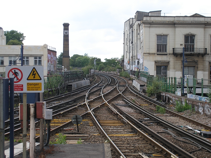 A westward view shows Herne Hill and Catford Loop routes converging from the left and right respectively. Brixton signal tower, as described in the main text, was formerly positioned immediately beyond the bridge over the high street, on the left-hand side. © David Glasspool