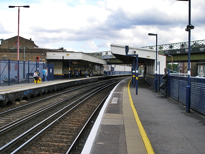 A second eastward view of the Herne Hill platforms better shows the substantial station building on the left, which rises high up from ground level, within the fork of the junction. The ridge-and-furrow roof of the original LC&DR canopy is concealed by the valance. On the right, we also see the third, and final, bronze sculpture. © David Glasspool