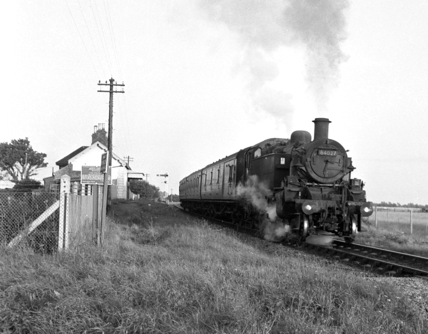 The lack of headcode discs in this Lydd-bound view suggests that Ramsgate-allocated BR Standard Class 2MT 2-6-2 Tank No. 84027 is propelling its three carriages into Brookland Halt from Appledore. Note the electricity warning flash sticker on one of the side tanks, presumably in connection with the installation of overhead wires in South Eastern Division goods yards for the then new E5000 series (Class 71) locomotives. The main station building on the disused former "down" platform was still in fine fettle at the time of this view, complete with canopy. The rendered finish of the main building can be seen, as can the concrete facings and the gabled end. The "down" starting signal, protecting the level crossing, is on the former track bed of the loop that once served the platform on that side. The former main building is today a dwelling, which in 2006 was extended to double the structure’s original size. © David Glasspool Collection