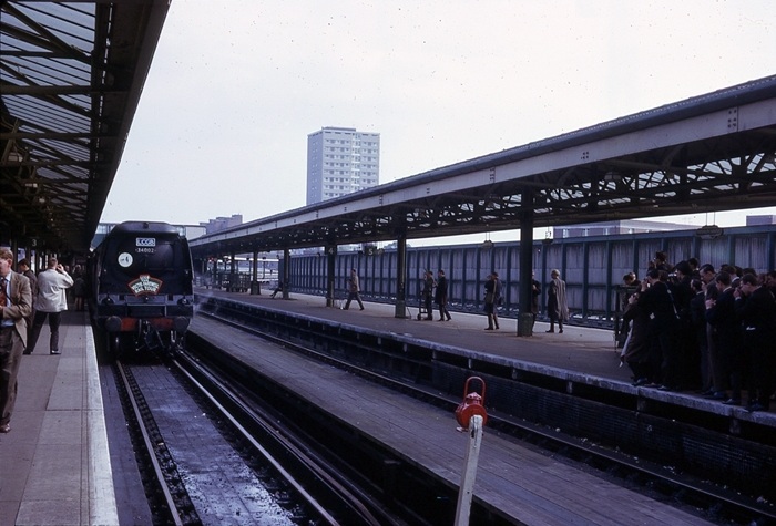 No. 34002 ''Salisbury'' is seen at Portsmouth Harbour's platform 3 on 3rd October 1965, after arriving with ''The Vectis Farewell Rail Tour'', organised by the ''Locomotive Club of Great Britain''. This ran via Chichester and also involved a return journey between there and Lavant, hauled by ''Coffee Pot'' Nos. 33020 and 33027. After a ferry crossing to the Isle of Wight, the tour continued and traversed the remaining lines of the island, before returning to Waterloo from Portsmouth behind Standard Class No. 73155. As for No. 34002, this locomotive was withdrawn April 1967. © David Glasspool Collection
