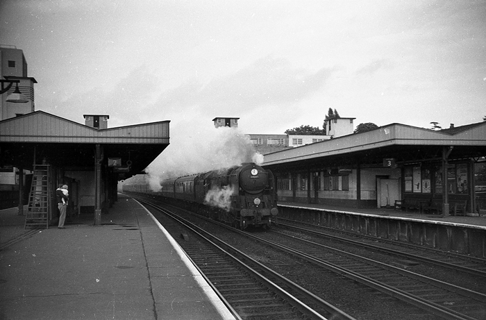 The distinctive environs of Surbiton station are seen in this view of rebuilt No. 34003 ''Plymouth'', as it races through non-stop on the centre line with a train for its namesake, in about 1963. This engine was rebuilt in September 1957 and was immediately re-allocated to Bricklayers Arms (73B) from Exmouth Junction. For three years it worked Kent Coast expresses out of Charing Cross and Cannon Street, before electrification saw it re-allocated again, this time to Salisbury. It was one of the earlier Pacific withdrawals, being taken out of service in September 1964 and scrapped in December of the same year. Many of the Bulleid engines had been made redundant at that time by dieselisation of the lines west of Salisbury. © David Glasspool Collection