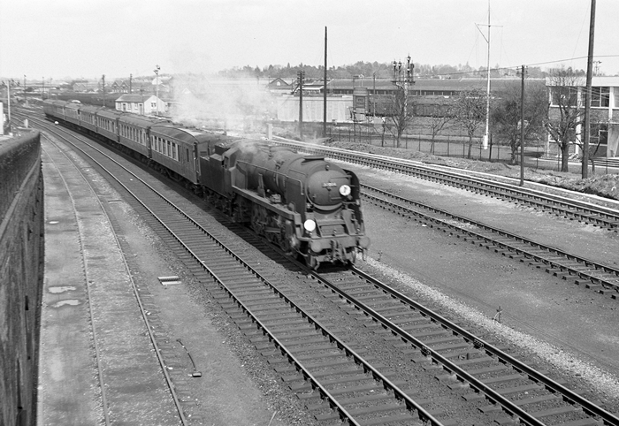 No. 34004 ''Yeovil'' is seen passing through Eastleigh in 1964 with the ''Bournemouth Belle''. This Pacific entered service in June 1945 as No. 21C104 and was formally named ''Yeovil'' on 2nd November of that year. The engine was renumbered No. 34004 in May 1948 and rebuilt in February 1958. It survived in service until the end of steam on the Southern Region, in July 1967. © David Glasspool Collection