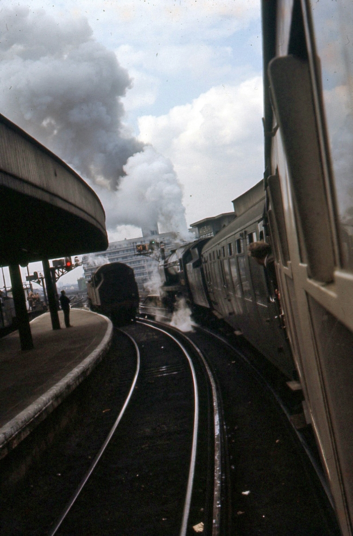 Now viewed from the train, No. 34021 sets off from Waterloo with the 10:00 Exeter relief on 10th June 1967. The engine is followed by a Bulleid composite and a BR Blue and Grey Mk 1 carriage. Alongside the Bulleid Pacific is the station pilot, a BR 2-6-2 3MT Tank Engine. Just above No. 34021 can be seen Waterloo signal box, which came into use on 18th October 1936 with a frame of 309 miniature levers. © David Glasspool Collection