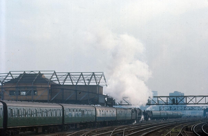 The unmistakeable surroundings of Clapham Junction provide the backdrop for this scene, once again depicting No. 34024 ''Tamar Valley'' on the 07:05 from Basingstoke. The carriage stock is a motley collection, comprising (from left to right) a BR Mk 1 suburban coach (non-gangway compartment stock), a green BR Mk 1 Corridor Brake, a blue and grey BR Mk 1 First Class Corridor, and finally, a Bulleid Corridor Composite. In the background is a BR 2-6-2 3MT Tank on an empty carriage working from Waterloo. Suspended above the tracks on the left is Clapham Junction ''A'' box, which came into use on 4th February 1912 and closed on 25th May 1990. © David Glasspool Collection