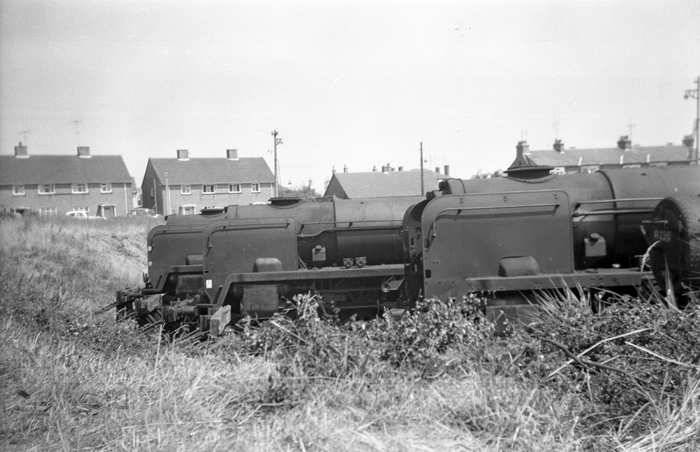 Many thanks to Richard Dixon for identifying the engines and location. Condemned Bulleid Pacifics are seen in the sidings at Weymouth shed in July 1967. The nearest is No. 34036 ''Westward Ho'', which had survived in service until the very end of steam on the SR. It was latterly dispatched to Cashmore's yard, Newport, and scrapped in February 1968. We are also afforded the briefest of glimpses of Merchant Navy No. 35026 ''Lamport & Holt Line'', its open firebox door just emerging from behind No. 34036's right-hand smoke deflector. Beyond, we see the front ends of two more Merchant Navy engines: No. 35014 ''Nederland Line'', and the furthest away, No. 35003 ''Royal Mail''. All these engines were scrapped at John Cashmore's, Newport, South Wales. Note the ''Mickey Mouse'' Ivatt Tank getting in on the act on the extreme right. © David Glasspool Collection