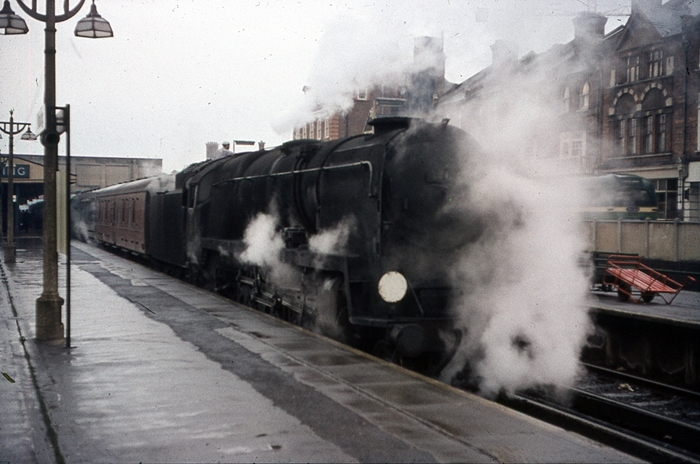 A filthy No. 34108 ''Wincanton'' is seen departing East Croydon on 19th March 1967 with the ''Southern Rambler'' rail tour, bound for Brighton. This was the last steam-hauled train to visit both Brighton and Eastbourne, and it started and finished at London Victoria. Note the crowd gathered on the bridge in the background. © David Glasspool Collection