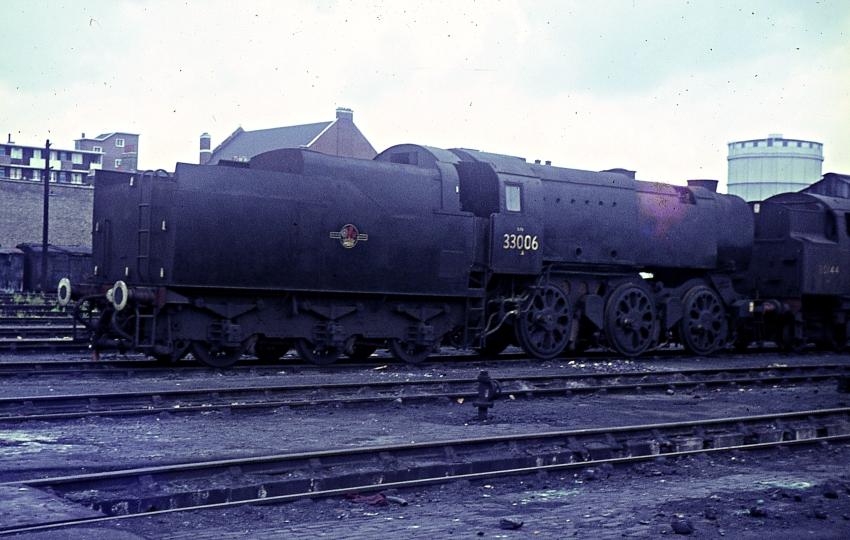 It's the end of the line for No. 33006, which is pictured without wheel coupling rods at Nine Elms, behind Standard Tank No. 80144. No. 33006 had become somewhat of a celebrity Q1 in its final months, having received white-painted buffers and smokebox door brackets, in addition to hauling a couple of rail tours through Hampshire and Wiltshire. © David Glasspool Collection