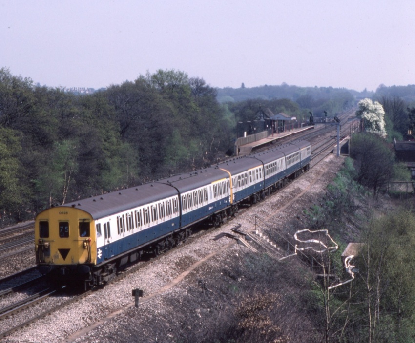 2-HAP No. 6096 is seen departing Byfleet & New Haw with a 4-VEP on a Waterloo to Guildford via Woking stopping service. The station can be seen in the background and at this time still possessed its original platform canopies. © David Glasspool Collection