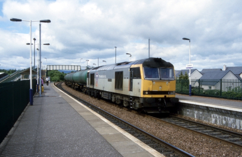 Class 60 No. 60063, still wearing the 1994 livery and logo of freight company “Transrail” (created in the run-up to privatisation), passes eastbound with what are thought to be empty road fuel tankers heading back to Grangemouth refinery. © David Glasspool Collection
