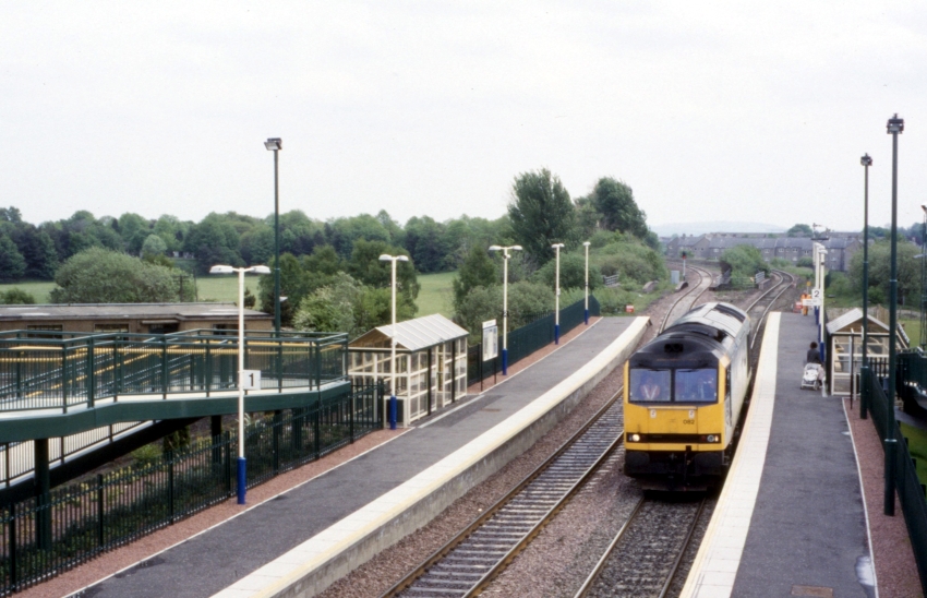 An eastward view from the footbridge shows Class 60 No. 60082 passing light engine towards Carmuirs East Junction, when the station was less than a year old. In the fork of the diverging tracks in the background is the former site of the station closed in 1967. © David Glasspool Collection