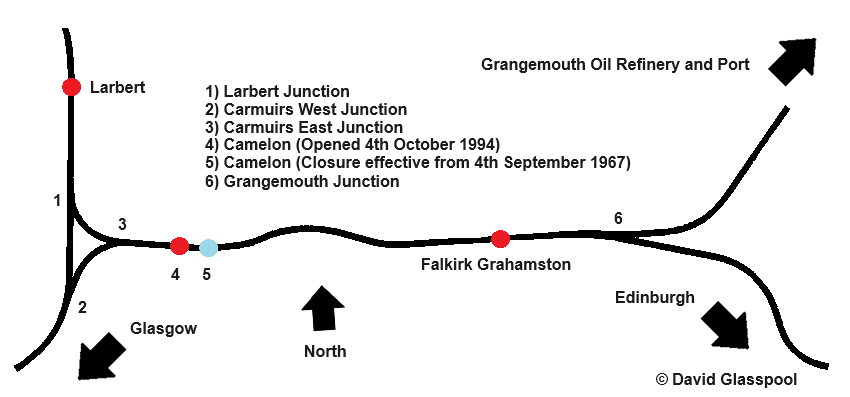 Located 27-route-miles west of Edinburgh Waverley, in the district of Falkirk, this modern station will reach thirty years of age in 2024. This is Camelon’s second station; the first comprised a single island platform, located about 970-yards east of Carmuirs East Junction. Of the latter, this is where lines to Perth (via Stirling) and Glasgow diverge. This station was originally scheduled to close on 6th June 1966, along with Elliot Junction, Easthaven, and West Ferry (ref: The Scotsman, 2nd February 1966). However, a brief reprieve was granted; formal consent for withdrawal of passenger services was given by the then Minister of Transport in July 1967, with closure scheduled for 4th September of that year (ref: The Scotsman, 29th July 1967).