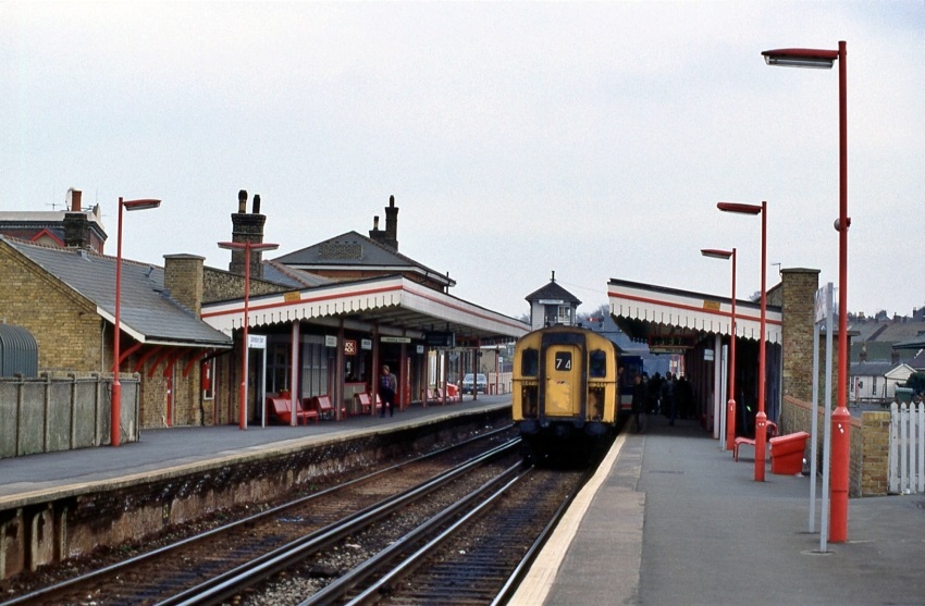 The Faversham to Dover route remained a pocket of semaphore signalling for many years, having escaped conversion during the Kent Coast Electrification Scheme. The "up" starter semaphore arm is seen on the left, as 4 CEP No. 1561 approaches with a Victoria to Dover Western Docks service. A track foot crossing at the London end of the platforms remains a feature of the station today. © David Glasspool Collection