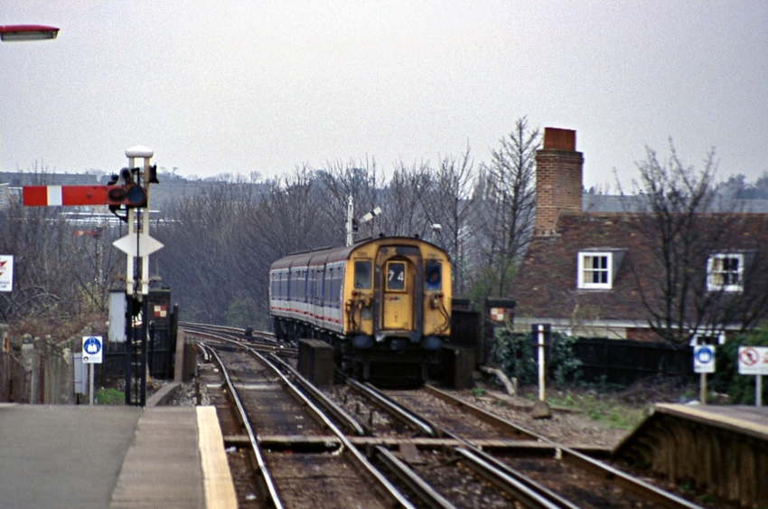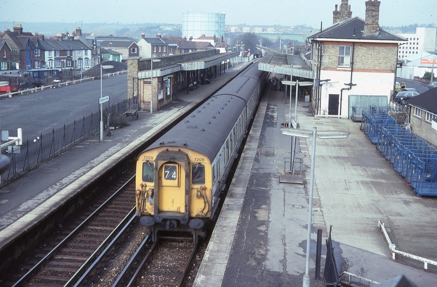 Unrefurbished 4 CEP No. 7208 is seen from the signal box with a Victoria to Dover Western Docks service. As per the previous photograph, the "down" platform featured a line of "BRUTE" trolleys, once a familiar sight at British Rail stations. A single siding had then recently been lifted from the tarmac area on the left, behind the "up" platform. © David Glasspool Collection