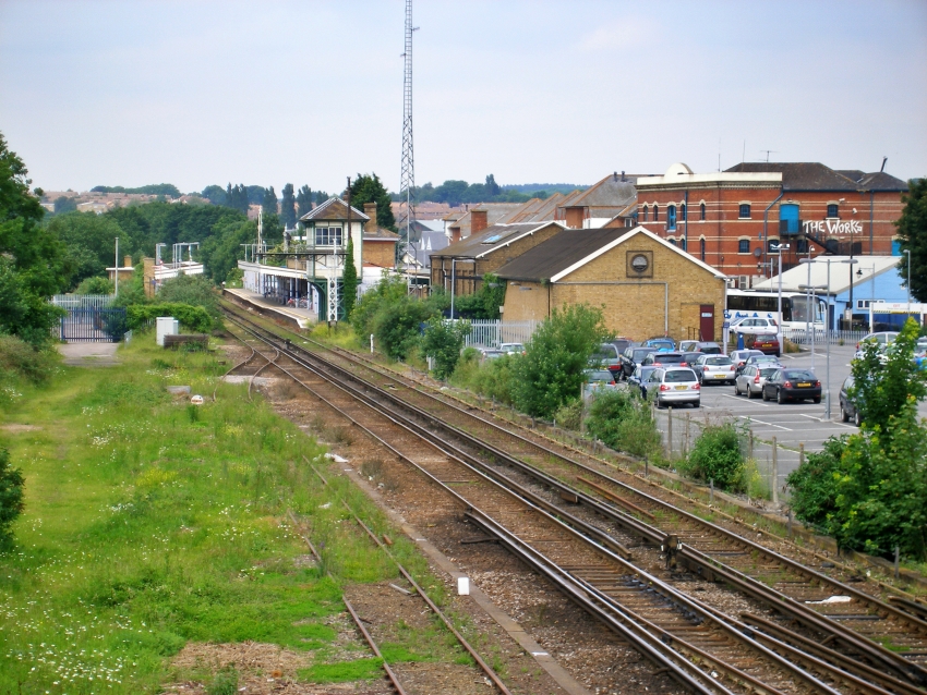 A general London-bound view shows that the 400 yard-long ''up'' side trailing goods siding is still in existence, but the former site of the opposing ''down'' side loop has since been swallowed up as part of an enlarged car park. On the right is the goods shed, which has since become host to a snooker club. © David Glasspool
