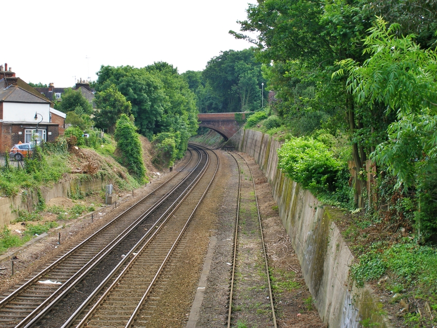 A Dover-bound view shows the "up" siding, with a surprising lack of overgrowth and vegetation, terminating at the road bridge. On the left and just be seen the cutting which was formerly host to a sand drag "escape lane", running off the "down" electrified loop. © David Glasspool