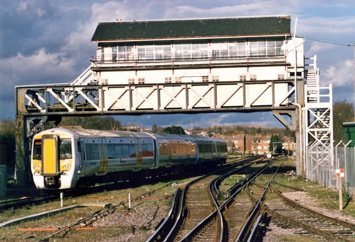 Departing towards Thanet underneath the signal box is No. 375926. The signal box was originally built by the SE&CR in 1901, during the enlargement of London Bridge. On the left of this view, behind the unit, immediately beyond the signal box, is the former site of the single-road engine shed. In the foreground, to the bottom right of this view is the sole remaining spur of the goods yard. By this time, colour aspect lights had replaced semaphore signals, but the signal box was still operational. © David Glasspool