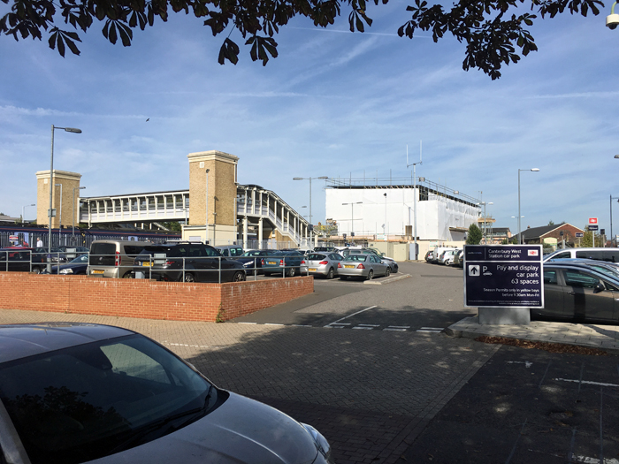 A northward view shows the footbridge, which was craned into position over the weekend of 4th/5th September 2010 and built at a cost of £541,000. The main building had disappeared under scaffolding and tarpaulin, presumably for cosmetic restoration. © David Glasspool