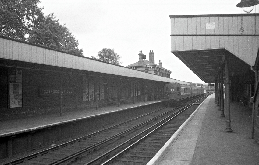 The Hayes, Addiscombe, and Bromley North branches were early recipients of third rail. When the Southern Railway assumed operation of ex-SE&CR lines, the company swiftly implemented a programme of electrification of the suburban routes. Full scheduled electric operation along the aforementioned branch lines commenced on 28th February 1926, from the ex-SER London termini. Circa 1930, the ornate canopy valances at Catford Bridge were replaced with plain vertical-timber types, but thereafter, little else changed at the site during this company’s tenure. British Railways implemented its own improvement of South Eastern Division suburban services during the mid-1950s, by initiating a train lengthening programme, which would see peak-time commuter services strengthened from eight to ten carriages. As part of this scheme, Catford Bridge witnessed its platforms extended at their northern ends during 1954 with Exmouth Junction-manufactured prefabricated concrete cast components. These extensions came complete with the Southern Region’s trademark concrete bracket lampposts.