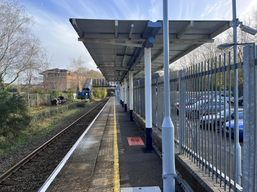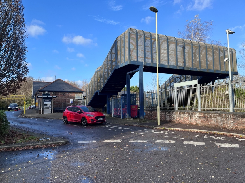 The station’s dominant feature is a substantial footbridge fully enclosed by mesh fencing, on the Eastleigh side of the main building. The footbridge provides passage over the railway to the general public, so is not restricted to rail users. © David Glasspool