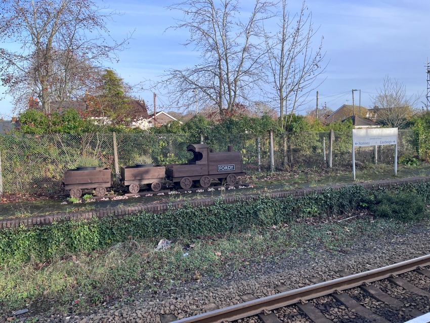 A sign showing the direction of travel upon a disused platform face is reminiscent of those stations west of Salisbury, on the rationalised line to Exeter via Yeovil Junction. The wooden train sculpture was installed by a local group on 8th December 2016. © David Glasspool