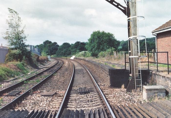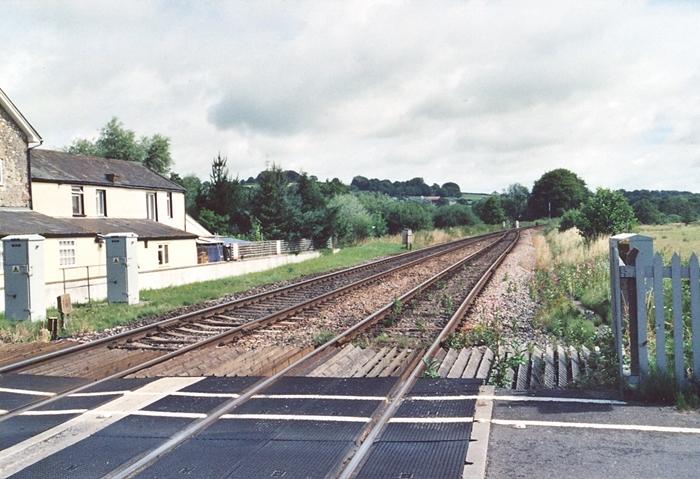 An Exeter-bound view reveals that the former ''down'' platform has completely disappeared and that the remaining ''up'' surface has seen a section cut out to accommodate the signal gantry. On the extreme left are the premises of the dairy works. © David Glasspool
