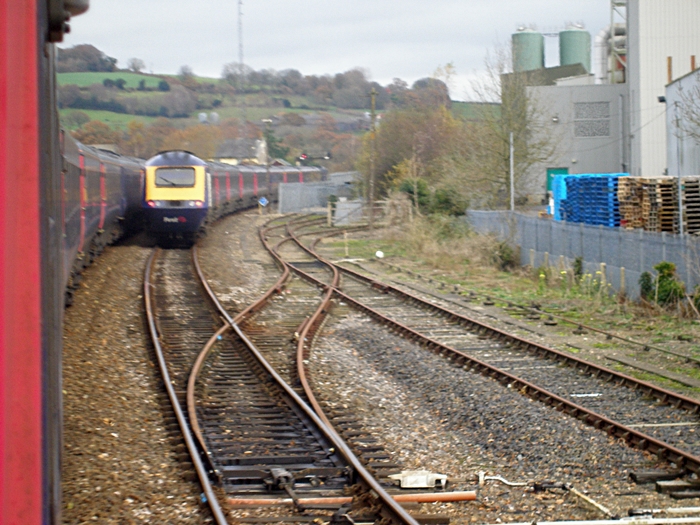 Connections between the dairy works and the former ''down'' line at Chard still remain, as evidenced in this view of InterCity 125 sets passing in the loop. This is a Yeovil-bound view from a ''down'' service, which is interestingly using the ''up'' side of the loop to pass the second HST. © David Glasspool
