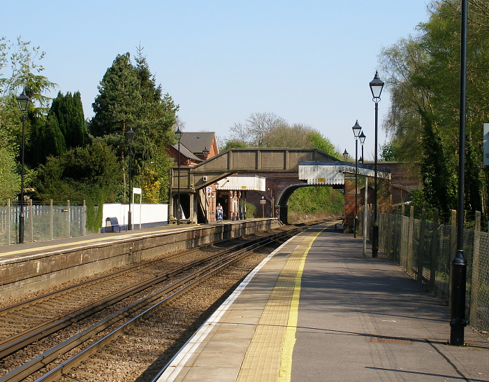 An eastward view shows a number of interesting features. Firstly, the attractive waiting shelter is in view - note the chunks taken out of the canopy, to allow for the passage of large container wagons. The window indentations are still much in evidence, although have for long been bricked up. Sandwiched in-between the main station building and the waiting shelter, straddling the tracks, is the concrete footbridge of 1961, whilst behind that is again the rebuilt bridge arch. This view also indicates just how tall the lamp posts actually are. The footbridge was replaced by a new one in late 2013 situated adjacent to the road bridge. © David Glasspool