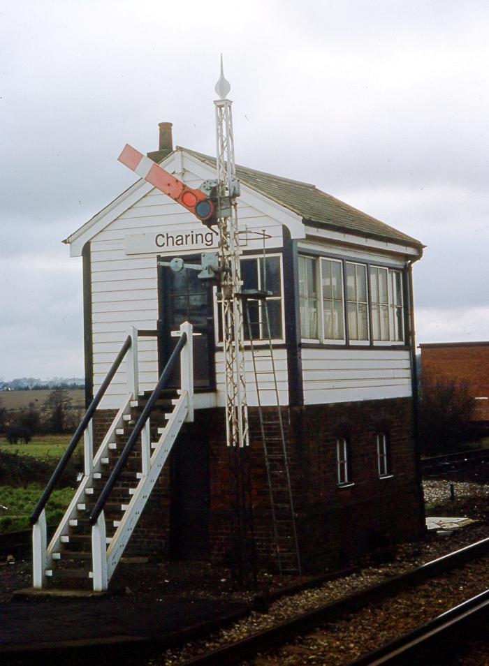Rural the station may have been, the layout here was in fact quite extensive. Every station on the 1884 extension was provided with freight facilities, which included the once common goods shed. Seven sidings were once evident on the ‘’down’’ side at Charing, six of which were westward-facing. One of these tracks formed a dock line, which terminated behind the ‘’down’’ platform, shortly before the main station building was reached. Of the remaining five, all trailed off from the running lines (of which there were direct connections with both ‘’up’’ and ‘’down’’ tracks) at an angle of about forty degrees. Finally, the seventh siding was to the contrary, it being eastward-facing. It did, however, have direct facing connections with both the aforementioned goods yard and the ‘’down’’ running line. The ‘’up’’ side was not without storage capacity, and a westward-facing refuge siding of considerable length (approximately 246 yards) was in evidence, this terminating behind the ‘’up’’ platform. As per the original Bat & Ball line and the Otford to Maidstone extension, contractors Saxby & Farmer were drafted in to signal the 1884 route to Ashford. One of this company’s attractive two-storey high signal cabins, complete with a brick base and timber upper half, was positioned just beyond the western end of the ‘’up’’ platform.