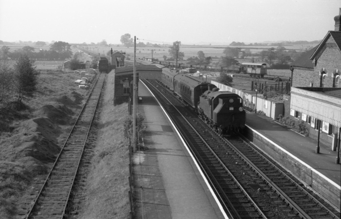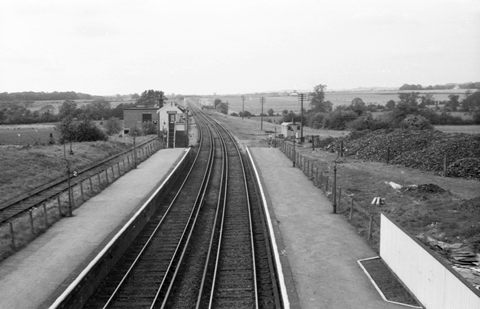 By the time of this view, again looking towards Maidstone from the footbridge, the tracks of the goods yard had been lifted, but the "up" refuge siding remained in place, now with an electricity substation alongside. The Saxby & Farmer signal box still controlled mechanical signalling, and both platforms were still equipped with Swan Neck lamps and SR "Target" name signs. © David Glasspool Collection