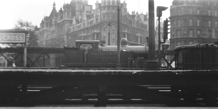 A view from about 1938 shows ex-SE&CR ''H'' class No. 1308 stabled at the platforms - the train shed and buffers are to the right, beyond the limits of the photograph. The colour aspect lights date from 1926, when a new signal box was opened across the tracks, at the end of the platforms. This view is in fact little changed today: in the background, on the far right, can be seen the ''Hôtel Métropole''. To the left of this, and taking centre stage, is the huge Gothic colossus, housing the ''National Liberal Club'' and ''Whitehall Court''. The engine, No. 1308, became No. 31308 under BR, and remained in service until December 1962. © David Glasspool Collection